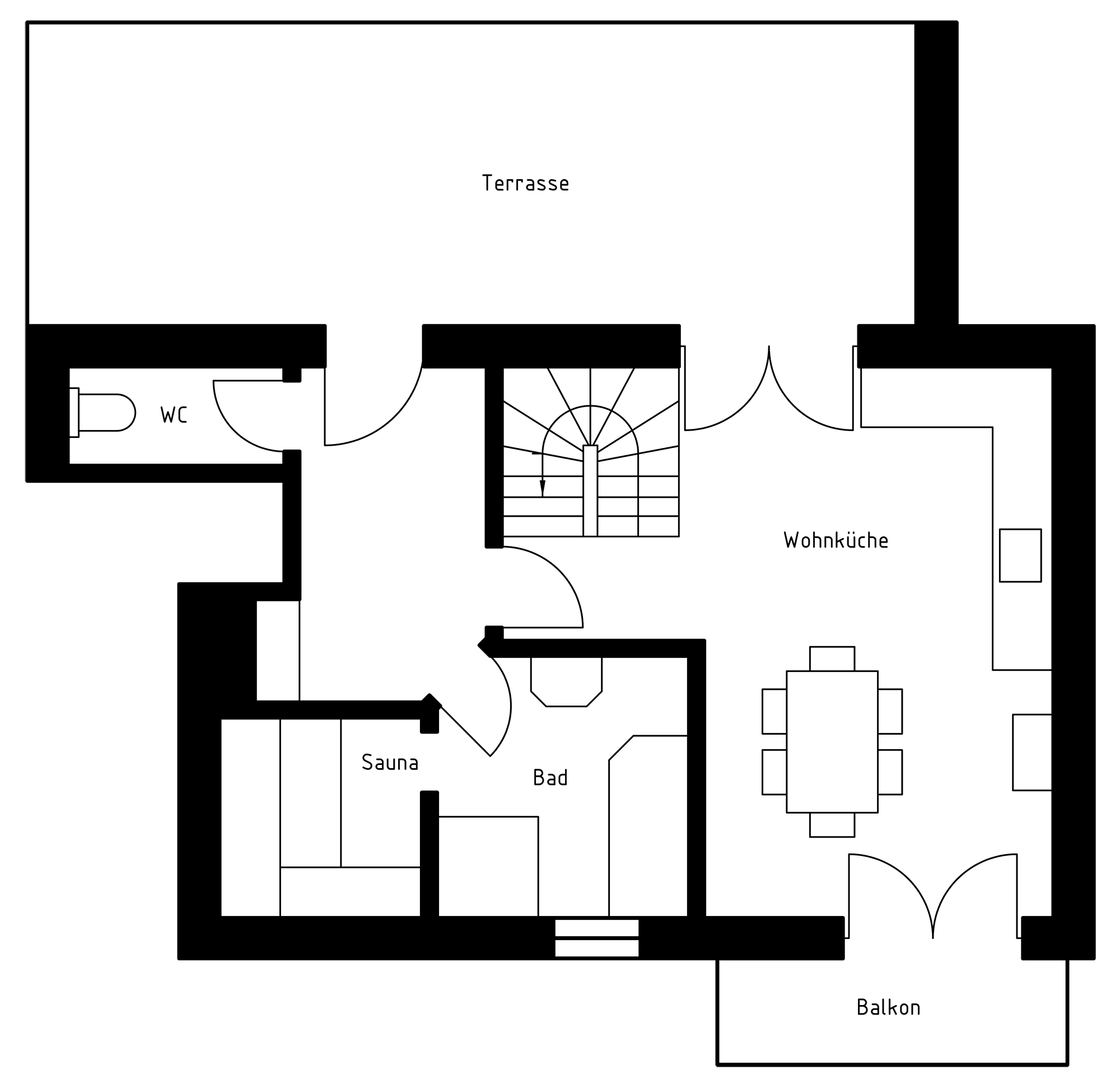 Das Apartment erstreckt sich über zwei Etagen. Im unteren Bereich befinden sich die Wohnküche mit Essbereich, ein Balkon, eine möblierte Terrasse, ein Badezimmer mit Dusche und Badewanne sowie ein separates WC. Über eine Treppe in der Wohnküche gelangt man in eine offene Galerie mit einem Doppelbett und zwei Schlafsofas. Von dort aus führt ein Zugang in ein separates Zimmer mit zwei Einzelbetten. Insgesamt stehen sechs Schlafplätze zur Verfügung. Auf Wunsch kann zusätzlich ein Babybett bereitgestellt werden.