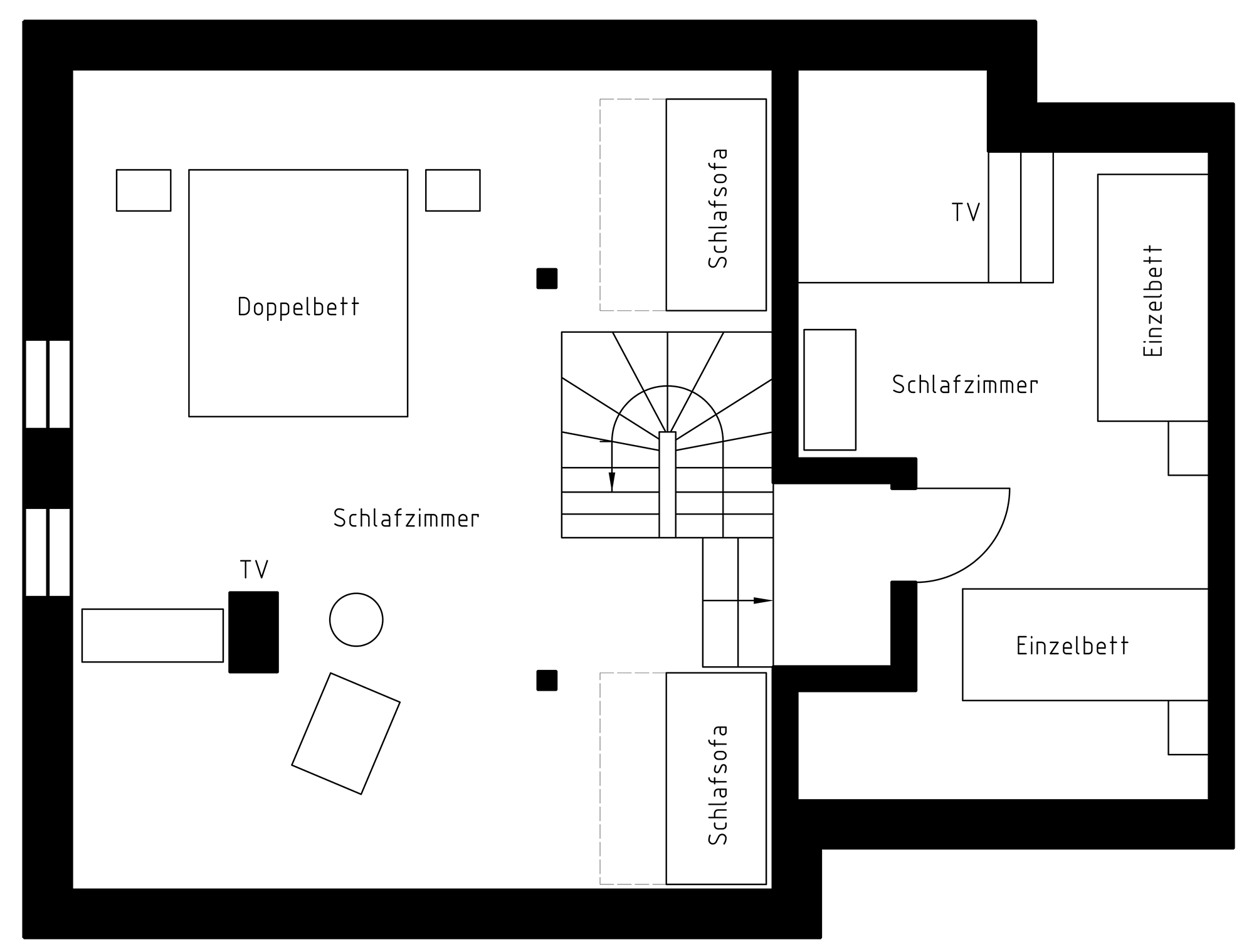 Schlafgalerie: 1 Doppelbett und 2 Schlafsofas